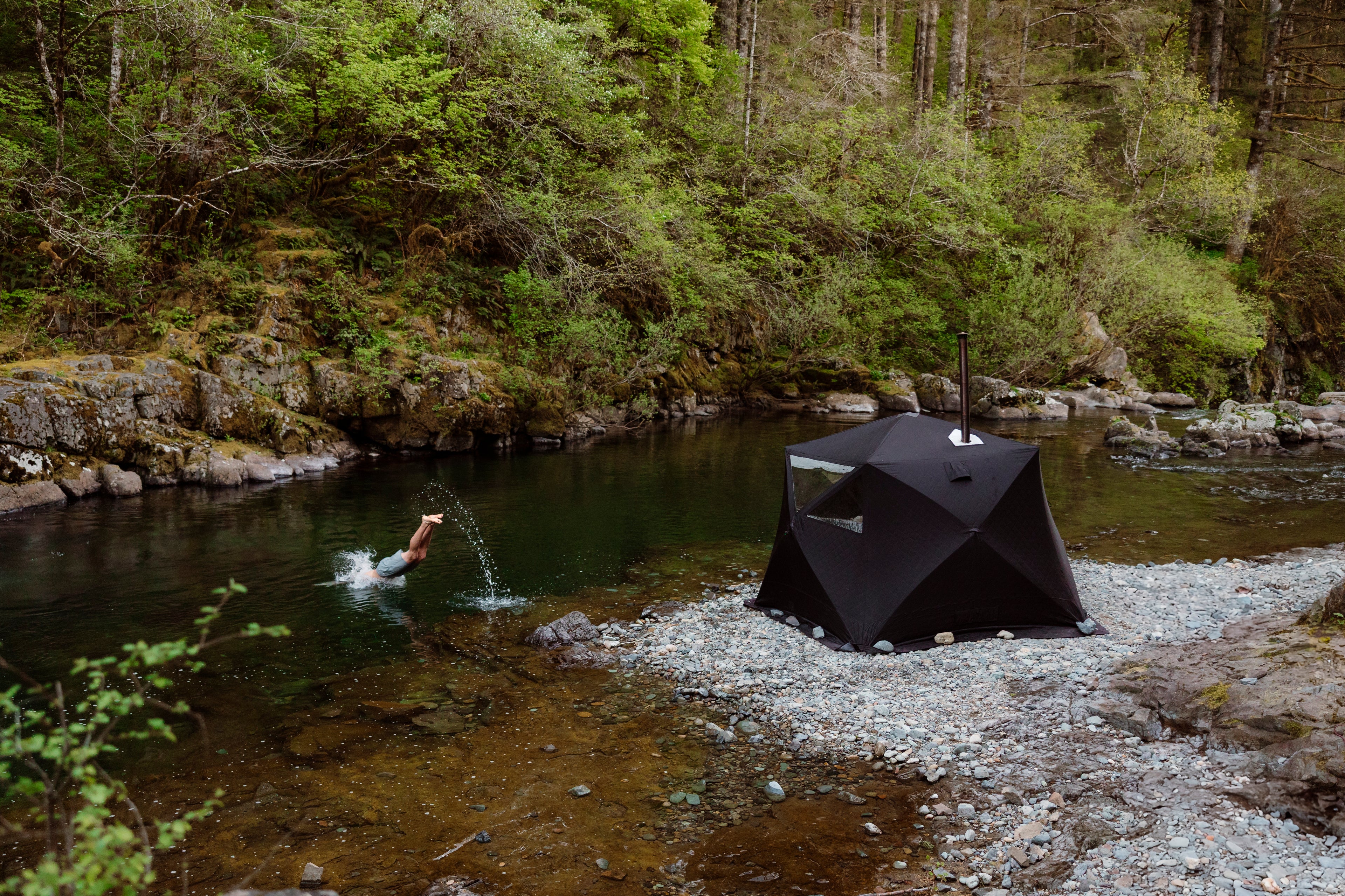 Our top-of-the-line wood burning tent sauna has a stainless steel stove that also happens to be North bend's only ADA accessible outdoor sauna.